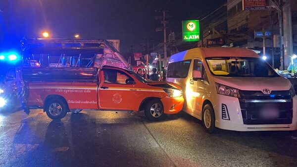 รถบรรทุก 6 ล้อ เบรกไม่อยู่ พุ่งเสยท้ายสองแถว ชนรถตู้ ผู้โดยสารเจ็บ6