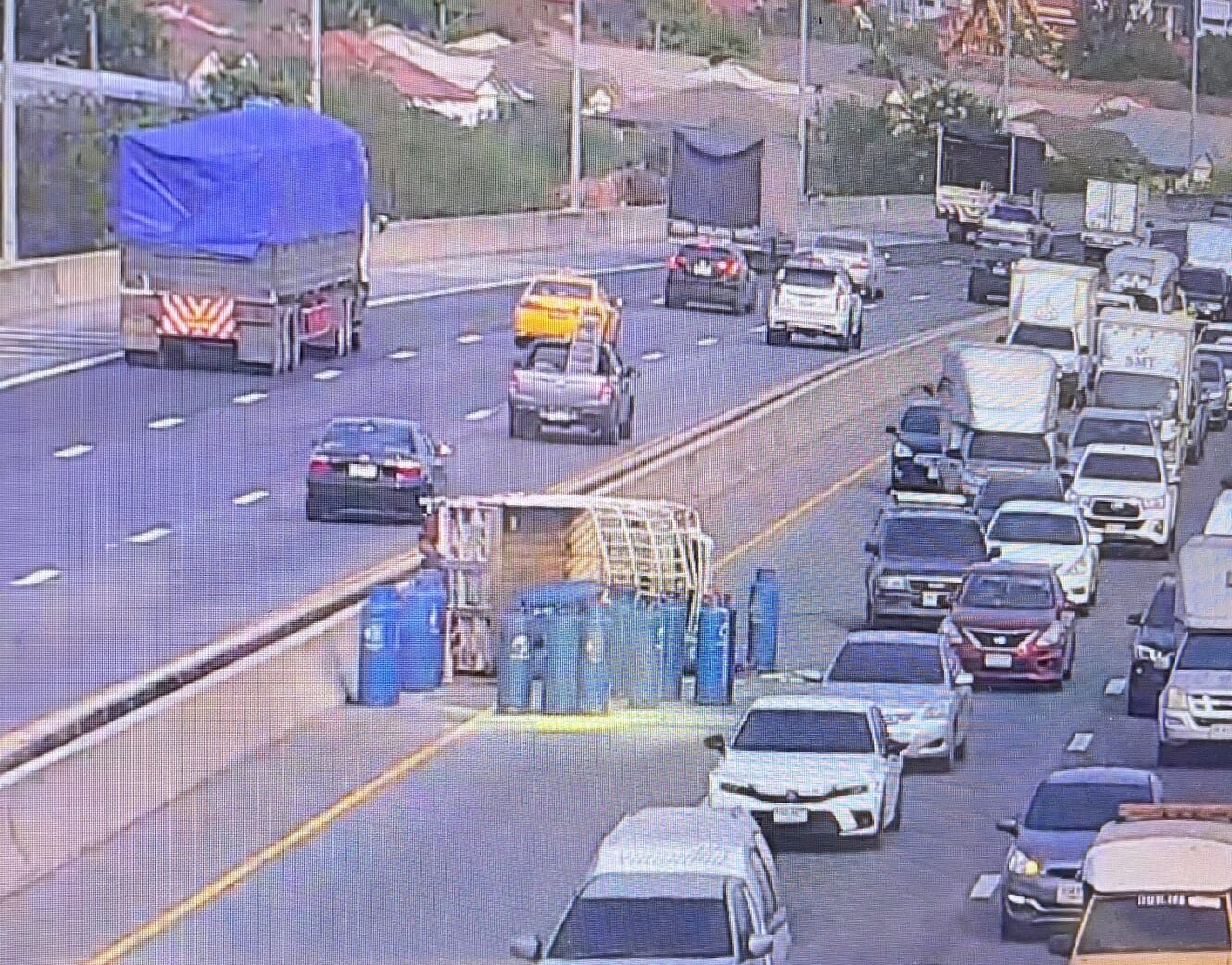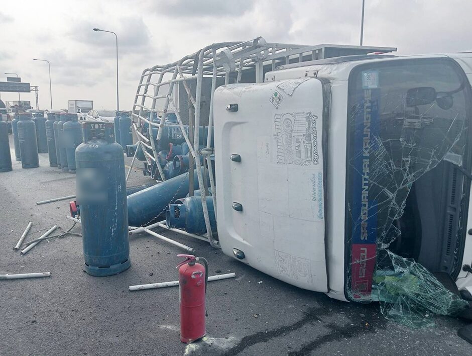 เป็นอุบัติเหตุที่เกิดขึ้นบนทางพิเศษกาญจนาภิเศษ ซึ่งพบว่า รถบรรทุกถังแก๊สจำนวนมากเกิดการพลิกคว่ำ ทำให้ถังกระจายเกลื่อนถนน โดยอุบัติเหตุดังกล่าวเกิดขึ้นเวลาประมาณ 08.30 น. โดย จส.100 รายงานว่า เกิดอุบัติเหตุ บนถนนเส้นทางพิเศษกาญจนาภิเษก จาก ด่านบางเมือง ที่บริเวณก่อนถึงทางลงเทพารักษ์ เล็กน้อย รถบรรทุกถังแก๊ส เสียหลักพลิกตะแคง ขวางช่องทางขวา มีผู้บาดเจ็บ 1คน การจราจรติดขัด